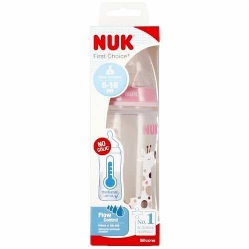 Butelka First Choice+ z wbudowanym wskaźnikiem temperatury zmienia swój kolor w zależności od temperatury zawartości butelki: jeżeli pokarm jest za gorący, wskaźnik, który zwykle jest niebieski zmienia kolor na biały. Wskaźnik temperatury NUK jest przewidziany jako dodatkowa weryfikacja. Prosimy o sprawdzenie temperatury bezpośrednio przed podaniem pokarmu dziecku. Butelka posiada wyjątkowo miękki smoczek silikonowy dostosowany do kształtu jamy ustnej. Butelka testowana w szpitalach dla optymalnego łączenia karmienia piersią i butelką. Posiada antykolkowy system odpowietrzania który pomaga zapobiegać kolce. Wygodna do napełniania i czyszczenia posiada szeroki otwór butelki. Butelka o pojemności 300 ml 6-18m ze smoczkiem silikonowym który kontroluje przepływ pokarmu.