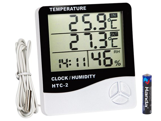 Wysokiej jakości niewielkich wymiarw stacja pogody z czytelnym wyświetlaczem LCD. Na panelu możemy odczytać aktualną temperaturę oraz wilgotność w pomieszczeniu, a także datę i czas. Ponadto, urządzenie umożliwia ustawienie alarmu, zapamiętuje maksymalne i minimalne pomiary temperatur oraz wilgotności powietrza. Dzięki wbudowanym przyciskom możemy zmienić tryb wyświetlania godziny 12/24H oraz ustawić skalę pomiarw temperatury na Celsjusza lub Fahrenheita. W zestawie znajduje się kompatybilna bateria