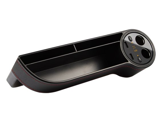 Samochodowy schowek szczelinowy z trzema przegrdkami przeznaczony do montażu z prawej strony kierowcy pomiędzy fotelem, a skrzynią biegw. Wyjątkowo ładne obicie w czarnym kolorze to pewność wpasowania się produktu do każdego wnętrza samochodu, a czerwona nić podkreśla wyjątkowy i nowoczesny design. W przedniej części schowka zostały wmontowane dwa dodatkowe gniazda zapalniczki wraz z włącznikami, dwa wejścia USB oraz czytelny wyświetlacz LED na ktrym pojawia się informacja o napięciu akumulatora samochodowego. Całość zasilana jest przy podłączeniu urządzenia do gniazda zapalniczki - na wtyku podłączenia znajduje się kontrolka sygnalizacyjna informująca o poprawnym działaniu.