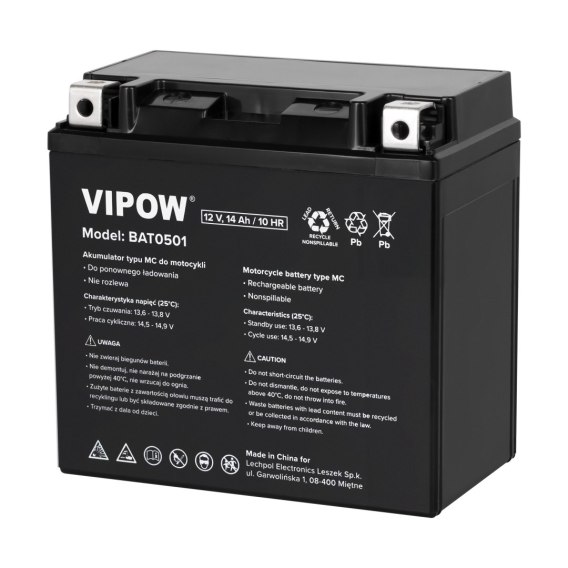 Akumulator VIPOW typu MC o napięciu 12V i pojemności 14Ah to niezawodne źródło zasilania dla motocykli, zaprojektowane z myślą o wydajności i długiej żywotności. Dzięki swoim zaawansowanym parametrom technicznym, akumulator ten zapewnia solidne wsparcie dla rozruchu i zasilania pojazdu, co sprawia go idealnym wyborem dla użytkowników szukających niezawodności i wydajności.