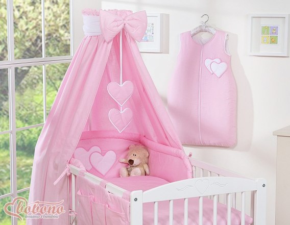 Duży baldachim bawełniany 160x250 cm- można go ładnie ułożyć wokół łóżeczka, ozdobnie pomarszczyć lub nawet umocować na dłuższym boku łóżeczka. Baldachim jest długi niemal do ziemi, poniżej dolnych szczebelków łóżeczka, nie będzie więc wpadał do wewnątrz nawet przy materacu opuszczonym na najniższym poziomie łóżeczka - jak to się niestety często dzieje przy tańszych pościelach, oszczędnie krojonych. Baldachim z tkaniny wykonany jest z tkaniny 100% bawełnianej, posiadającej atest Okotex lub TUV. + Wiszące dwa serduszka+duża gruba kokarda - Dwa wiszące serduszka z miękkim wypełnieniem. Przyciągają uwagę dziecka w pierwszych miesiącach życia skutecznie zastępując karuzelkę. Duża gruba kokarda stanowi piękne zwieńczenie całości.