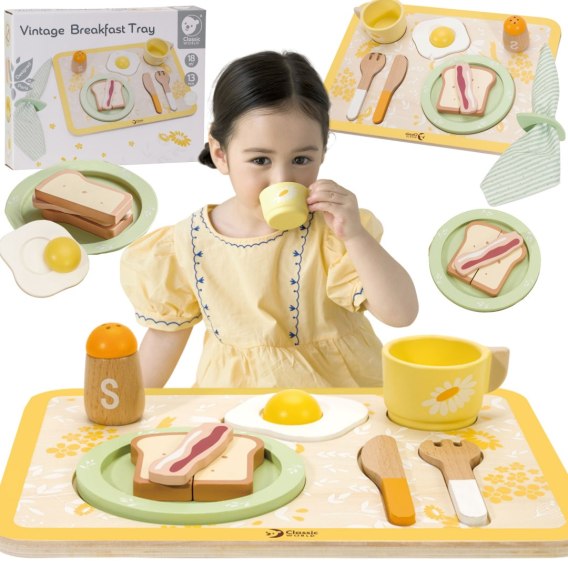 - zestaw zawiera talerzyk, sztućce, kubek, sól, pieprz, jajko, tosty, plaster bekonu, serwetkę oraz tackę do serwowania,