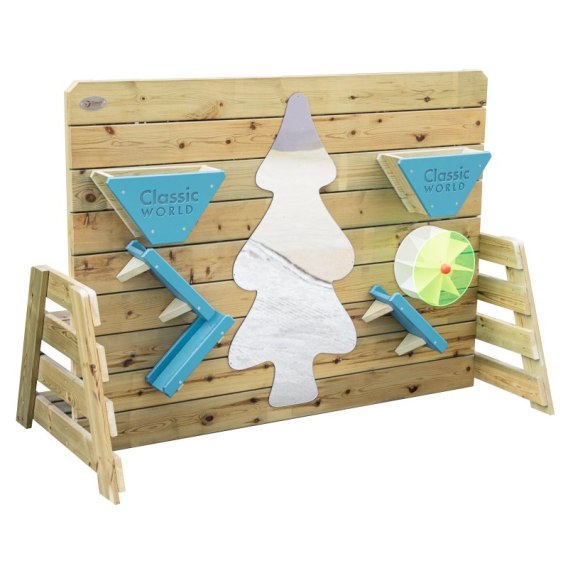 Drewniana Ścianka od marki CLASSIC WORLD to super rozwiązanie na uzupełnienie placu zabaw, ale także domowego ogródka. Jest to wielofunkcyjny zestaw składający się ze strony do zabawy, oraz do odpoczynku. Produkt wykonany z wysokiej jakości drewna, pomalowanego nietoksycznym impregnatem- całkowicie bezpiecznym dla dzieci. Po prawej stronie znajduje się lejek - wystarczy napełnić go piaskiem i obserwować, jak przelewa się przez otwór, który wprawia młynek w ruch. Po lewej stronie znajduje się także lejek, do którego wsypujemy piasek i obserwujemy, jak przelewa się przez otwór na strome boki zabawki, tworząc zjeżdżalnię. Na środku umieszczone jest folia lustrzana w kształcie choinki, co na pewno spodoba się twojemu dziecku! Z drugiej strony tablicy, znajduje się strefa wypoczynku- drewniana wygodna ławeczka. Dziecko może na niej usiąść, a po skończonej zabawie na dolną półkę odłożyć zabawki.