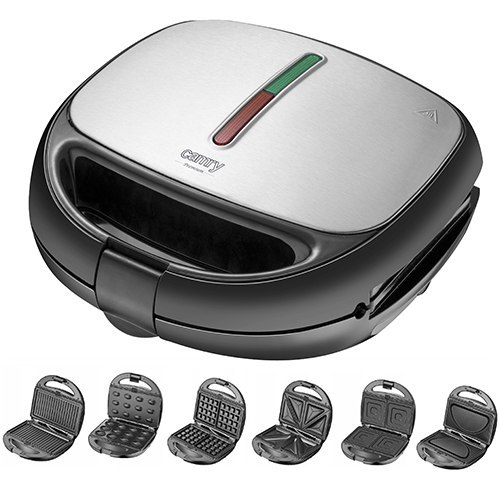 Wielofunkcyjny opiekacz Camry 3057 to, aż sześć funkcji w jednym urządzeniu! Dzięki wysokiej mocy 1200W urządzenie umożliwia nie tylko opiekanie kanapek, ale także dwustronne grilowanie żywności, pieczenie chrupiących gofrów oraz ciasteczek typu orzeszki. Urządzenie wyposażone jest w 5 typów wymiennych płytek: do kanapek z chleba tostowego (płytka z trójkątami do cieńszych kanapek), do kanapek z chleba tradycyjnego (płytka z kwadratowymi wgłębieniami na grubsze kanapki), do grilowania (płytka z podłużnymi rowkami), do gofrów (płytka w kratkę), do ciasteczek typu orzeszki (płytka z rowkami na kuleczki ciasta), do omletów (płytka z okrągłym wgłębieniem)