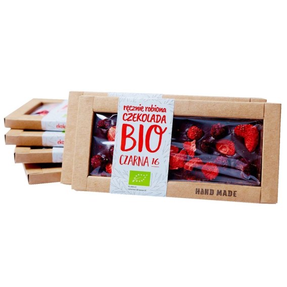 Masa kakaowa minimum 56,5 %. Czekolada ręcznie robiona. Zawiera liofilizowane truskawki i jeżyny.