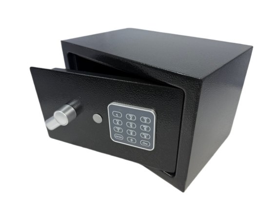 Czarny kompaktowy sejf biurowy na kod i klucz