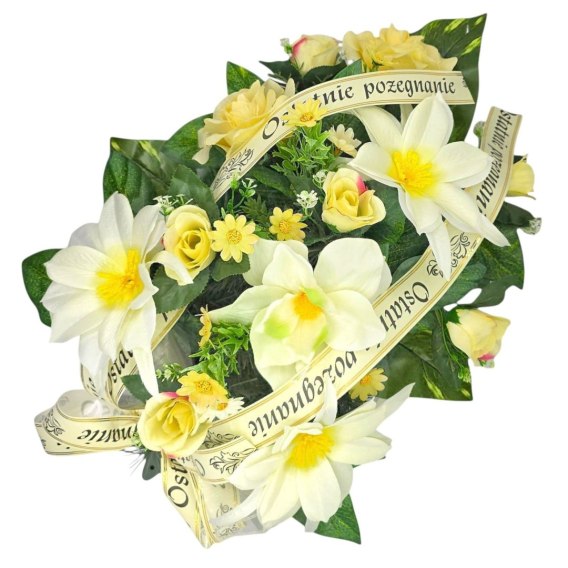Wiązankę cechuje gęsty splot sztucznych gałązek iglastych, które tworzą estetycznie wyglądające tło dla unikalnej kompozycji sztucznych kwiatów. Starannie dobrane kwiaty są niezwykle realistyczne i naturalne, dodając wiązance autentyczności i podkreślając jej uroczysty charakter.