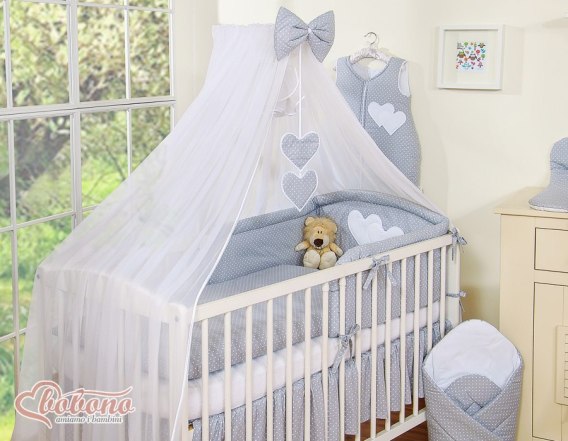 Duża moskitiera do łóżeczka dziecięcego z białego szyfonu z serduszkami i kokardką -kropki na szary