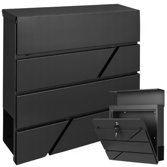 Duże, otwierające się do przodu drzwiczki zamykane są na zamek z dźwignią zamykającą i otwierają się na tyle szeroko, aby pozwolić na łatwy dostęp do wnętrza skrzynki na listy, a tym samym sprawne wyjęcie z niej nawet większej korespondencji. Klasyczna kolorystyka oraz ciekawy nowoczesny styl skrzynki dobrze komponują się z każdego rodzaju powierzchnią, bez względu na jej strukturę oraz barwę.