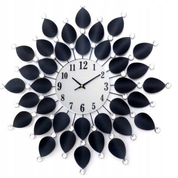 Dodatkowo, eleganckie metalowe czarne listki, ozdobione błyszczącymi kryształkami, nadają zegarowi unikalnego charakteru.