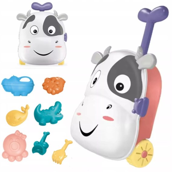 Walizka w kształcie krówki z foremkami do piasku i wbudowanym młynem zostały wykonane w żywych kolorach, które przykują uwagę malucha. Walizka z foremkami to idealny prezent dla każdego dziecka, które uwielbia spędzać czas na świeżym powietrzu w piaskownicy z rówieśnikami.