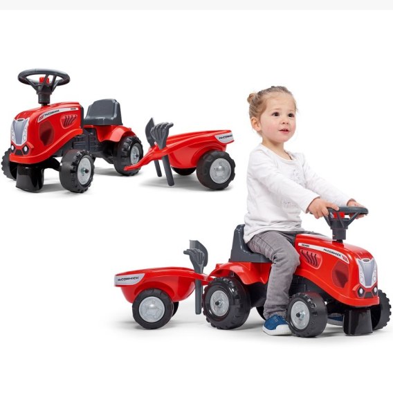 Traktorek Jeździk Baby Mac Cormick z przyczepką to spełnienie marzeń niejednego małego traktorzysty.Starannie wykonany, z dbałością o najmniejszy szczegół! Żaden prawdziwy Farmer by takim nie pogardził. Pojazd wykonany z najwyższej jakości tworzywa przeznaczony dla dzieci od 12 miesiąca życia. Pojazd jest wyposażony odpinaną przyczepę z panelami oraz kierownicę z klaksonem. Kołatraktorka zostały wykonane z wysokiej jakości plastiku. Dodatkowo do traktorka mamy do zabawy dla naszej pociechy grabki oraz łopatkę.