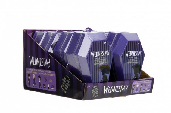Metalowe figurki z bohateriami serialu Wednesday zapakowane w zadrukowanej saszetce w kształcie trumny. Każda saszetka zawiera jedną figurkę oraz 1 akcesorium niespodziankę. Display 8 sztuk.