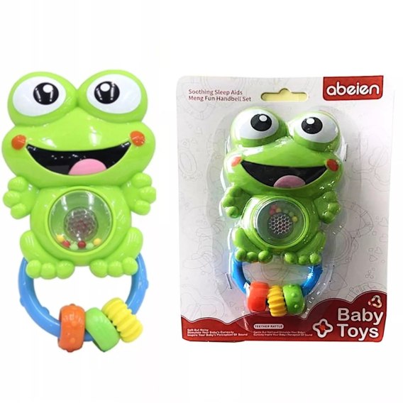 Żabka posiada uchwyt w kształcie okręgu, który idealnie dopasowuje się do rączki. Znajdują się na nim 3 koraliki sensoryczne o różnych płaszczyznach.