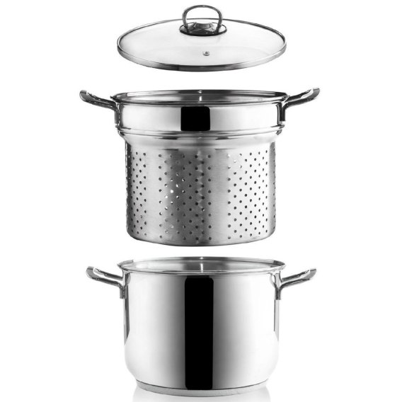 WYGODNY - Wyposażony w szklaną pokrywkę z otworem na ucieczkę nadmiaru pary. Zarówno garnek jak i wkład na parę posiadają wygodny uchwyty, które ułatwią przenoszenie.