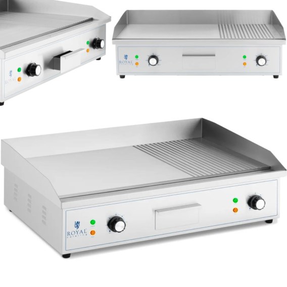 Profesjonalna płyta grillowa marki Royal Catering to sprzęt dla branży HoReCa. Sprawdzi się w restauracjach, bufetach, barach szybkiej obsługi, hotelowych restauracjach i na przyjęciach z cateringiem. Urządzenie nadaje się do smażenia jajek, kiełbasek, naleśników, bekonu, opiekania tostów itp. Nieryflowana i ryflowana powierzchnia grillowa o wymiarach 727 x 420 mm umożliwia jednoczesne smażenie wielu porcji, np. steków lub burgerów. Obudowa wykonana została ze stali nierdzewnej, co sprawia, że sprzęt jest odporny na wysoką temperaturę, łatwy w czyszczeniu i estetyczny. Powierzchnię grzewczą o grubości 10 mm wykonano z żelaza. Rant chroni przed pryskającym tłuszczem. Moc płyty grillowej wynosi 4400 W.Temperatura jest regulowana w zakresie 50-300°C. O działaniu sprzętu informują lampki kontrolne. Wygodną obsługę zapewniają wyjmowana tacka na wytopiony tłuszcz oraz antypoślizgowe nóżki.