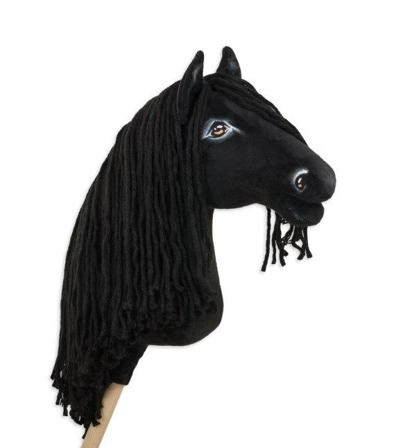 Czarny duży Hobby Horse fryzyjski z charakterystyczną bardzo długą i bardzo gęstą czarną grzywą. Grzywa jest ponad dwa razy dłuższa niż innych koni, gęsta, czarna.