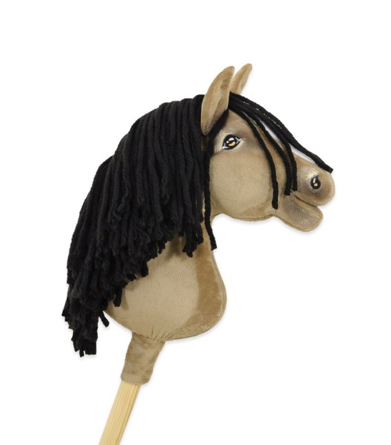 Kremowy konik Hobby Horse maści bułanej, z czarną długą miękką grzywą idealną do tworzenia pięknych fryzur. Biała strzałka na pysku.