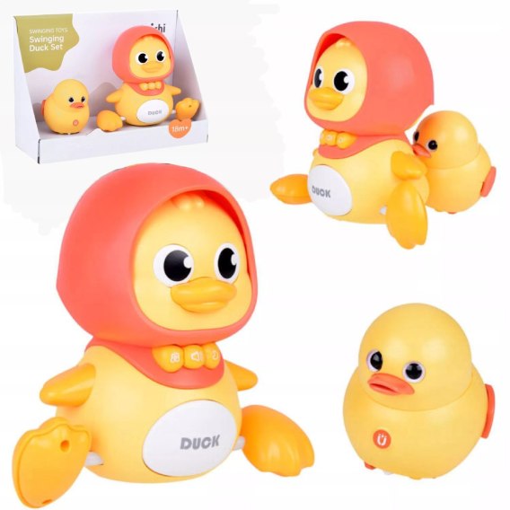 Zestaw zawiera jedną dużą kaczuszkę - mamę i małe kaczątko. Dzięki muzyce, efektom świetlnym i różnym trybom zabawy, kaczuszka wspiera rozwój dziecka, zachęca do raczkowania i aktywności ruchowej, jednocześnie dostarczając mnóstwo radości.