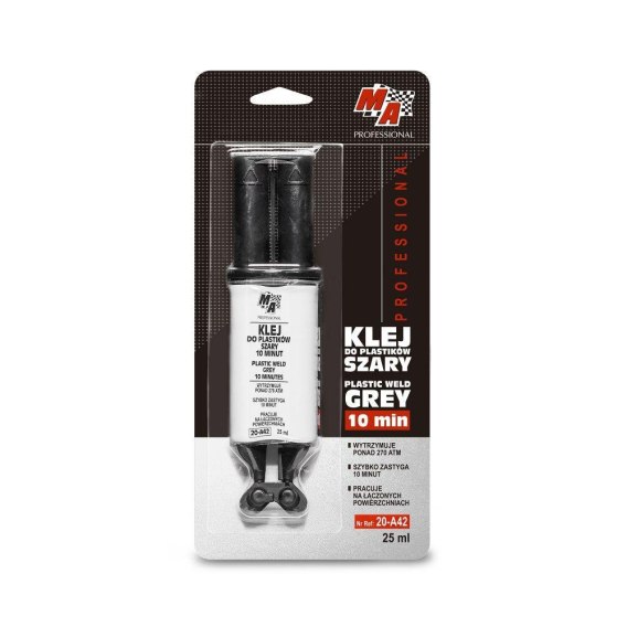 Klej do plastików MA Professional to szybko utwardzająca się masa przeznaczona do naprawy uszkodzonych / pękniętych przedmiotów wykonanych z różnych tworzyw sztucznych oraz innych materiałów. Skutecznie reperuje np. pęknięte zderzaki i lusterka samochodowe, plastikowe atrapy oraz inne elementy. Pracuje na łączonych powierzchniach. Produkt tworzy bardzo trwałe elastyczne spoiwo odporne na działanie temperatur do 120°C. Jest odporny na działanie olejów samochodowych, przekładniowych i hydraulicznych, benzyny, wody oraz wielu innych substancji. Wstępne utwardzenie następuje po upływie około 10 minut w zależności od temperatury otoczenia. Po dwóch godzinach produkt jest utwardzony w 80%. Pełne utwardzenie po 24 godzinach.