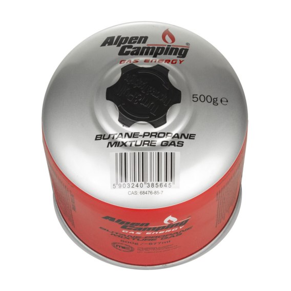 Kartusz gazowy 500g Alpen Camping. certyfikat: Pi 0437, zgodny z EN417, propan-butan, zakres -10°c do+ 40°c, zawór gwintowany 7/