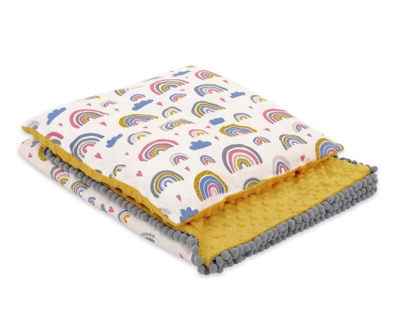 Dwustronny kocyk ozdobiony dekoracyjnymi pomponikami. Idealny kocyk na spacery i drzemki w domu. Kocyk jest niezwykle delikatny i lekki. Wykonany z mięciutkiego minky i kolorowej 100% bawełny. Doskonale pełni też funkcję okrycia, które chroni dziecko przed chłodem. Wykonany z najlepszych jakościowo materiałów, delikatnych i przyjaznych dla dziecka.
