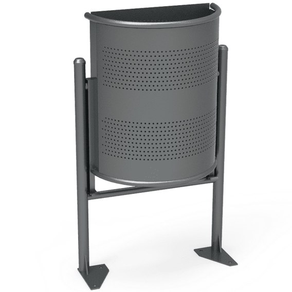 Półokrągły kosz uliczny wykonany z trwałych materiałów i zabezpieczony przed działaniem warunków atmosferycznych. Dzięki półokrągłemu pojemnikowi na odpadki kosz można zamontować pod ścianą czy murem oraz wszędzie tam gdzie występuje ograniczona ilość miejsca. Pojemnik na śmieci opróżnia się w bardzo łatwy sposób unosząc go do góry i obracając w bok.