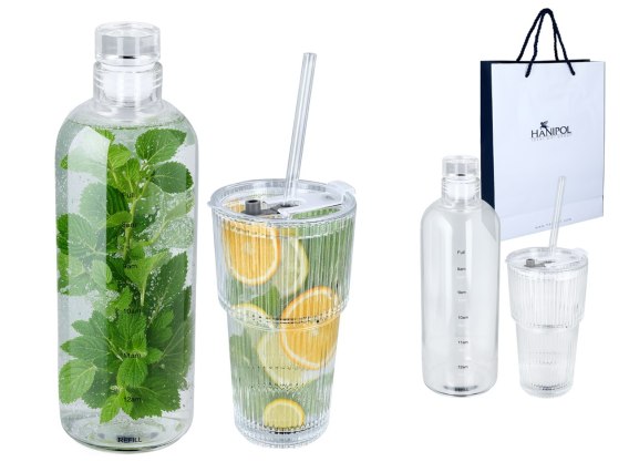 Kpl. Szklanka ze słomką i przykrywką oraz szklana butelka.