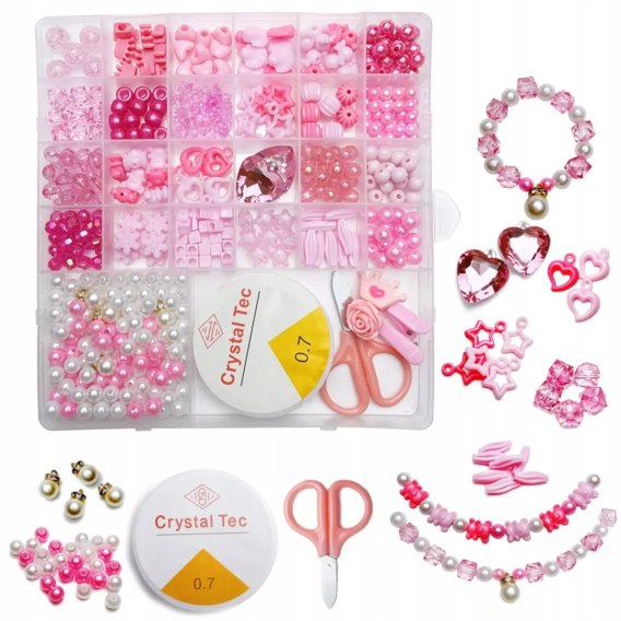 Kreatywny zestaw zawiera około 300 elementów, co pozwoli na wykonanie wielu różnych elementów biżuterii takich jak bransoletki czy naszyjniki. W komplecie są także nożyczki i żyłka do nawlekania koralików, dzięki czemu zawiera wszystko co potrzebne, aby zacząć tworzyć własne projekty.