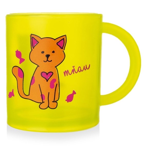 WYTRZYMAŁY- Wykonany z najwyższej jakości tworzywa w półprzezroczystym, żółtym kolorze. Posiada kolorowy dekor przedstawiający kotka. Kubek jest lekki, a jednocześnie wytrzymały.