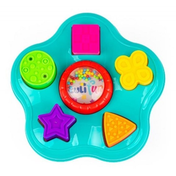 Uroczy sorter - kwiatek posiada pięć ramion, a na każdym z nim znajduje się otwór w innym kształcie. Zadanie malucha polega na dopasowaniu klocków z zestawu do odpowiednich otworów. Gdy wszystkie znajdą się we wnętrzu kwiatka, wystarczy zdjąć pokrywkę z sorterem i wysypać klocki, aby rozpocząć zabawę od nowa. Na środku pokrywy znajduje się grzechotka z koralikami, której obręcz, przy przekręcaniu, wydaje terkoczący odgłos. Praktyczny pojemnik stanowi skrytkę, w której można przechowywać klocki dołączone do zestawu.