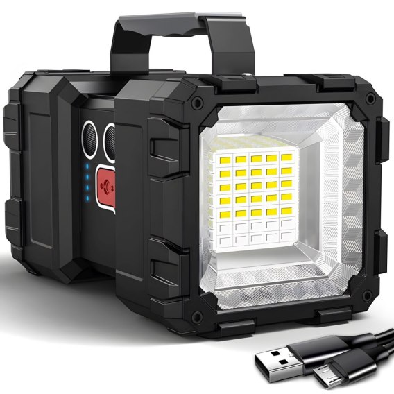 Kod produktu: 1029888 Latarka szperacz o mocy 40W to wielofunkcyjne źródło światła, które sprawdzi się zarówno w warunkach domowych, jak i na zewnątrz. Wyposażona w akumulator litowy z możliwością ładowania przez port USB, pełni także rolę powerbanka. Dzięki zasięgowi do 800 metrów i jasności 1000 lumenów zapewnia doskonałe oświetlenie w każdych warunkach. Różne tryby pracy, długi czas świecenia oraz wygodna rączka i możliwość montażu na statywie czynią ją niezwykle praktycznym rozwiązaniem. Cechy produktu: