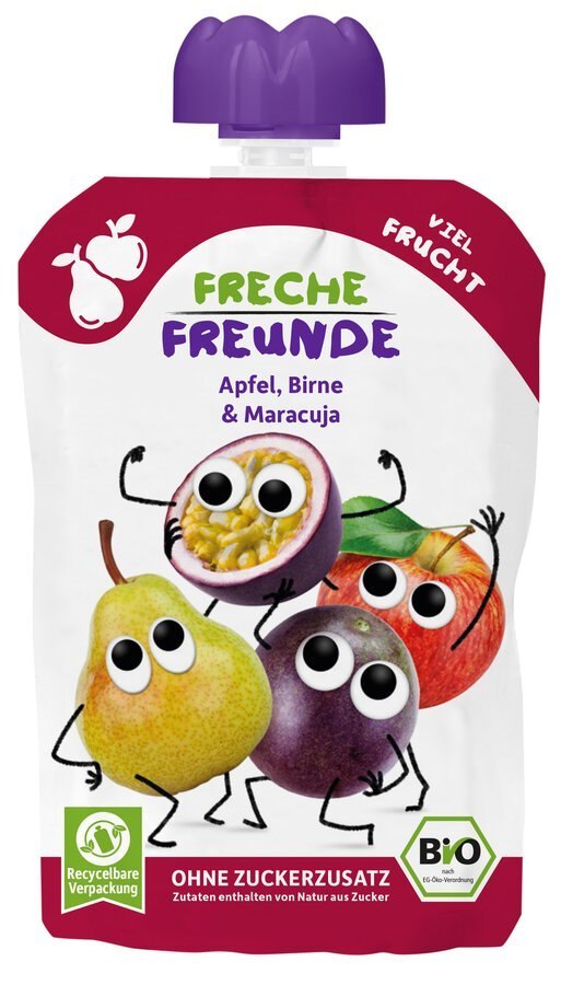 MUS JABŁKO - GRUSZKA - MARAKUJA BEZ DODATKU CUKRÓW BEZGLUTENOWY OD 6 MIESIĄCA BIO 100 g - FRECHE FREUNDE