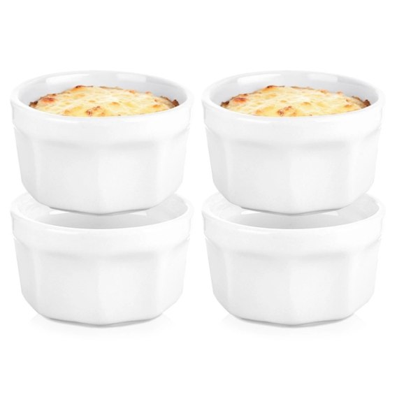 Zestaw czterech małych miseczek o uniwersalnym zastosowaniu. Wykonane z porcelany w białym kolorze. Idealne na dipy oraz przekąski. Nadają się do zmywarki i zapiekania.