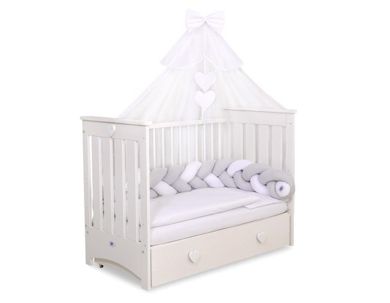2. Wiszące dwa serduszka + duża gruba kokarda - Dwa wiszące serduszka z miękkim wypełnieniem to słodkie i niepowtarzalne uzupełnienie kompletu pościeli.Przyciągają uwagę dziecka w pierwszych miesiącach życia skutecznie zastępując karuzelkę. Duża gruba kokarda stanowi piękne zwieńczenie całości.