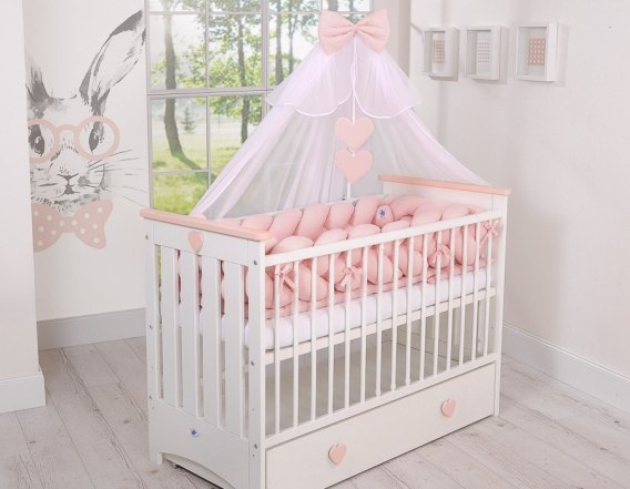 2. Wiszące dwa serduszka + duża gruba kokarda - Dwa wiszące serduszka z miękkim wypełnieniem to słodkie i niepowtarzalne uzupełnienie kompletu pościeli.Przyciągają uwagę dziecka w pierwszych miesiącach życia skutecznie zastępując karuzelkę. Duża gruba kokarda stanowi piękne zwieńczenie całości.