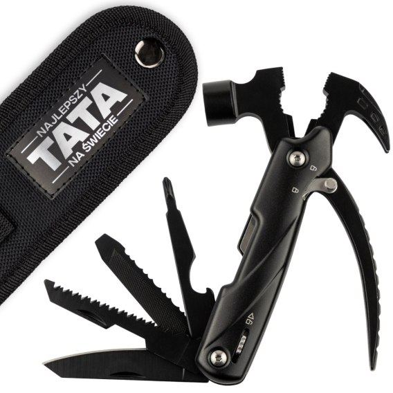 Młotek, obcęgi, nóż - scyzoryk, śrubokręty, pilnik, otwieracz, przecinak do drutu, skrobaczka do ryb, wyciągacz gwoździ i piła - w jednym narzędziu dla Taty.