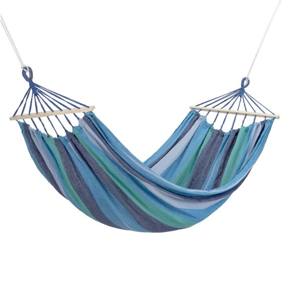 To hamak, przeznaczony do zawieszenia np. między dwoma drzewami. Łatwy w montażu, wszystkie niezbędne przybory, znajdują się w zestawie. Już po kilku chwilach, będziemy mogli oddać się, błogiemu odpoczynkowi. Drewniana belka o długości 70 cm, umieszczona w hamaku jako wzmocnienie sprawia, że materiał nie będzie się naciągał, przez co jego sprężystość będzie cały czas na takim samym, wysokim poziomie. Dzięki temu, będziemy odczuwali komfort użytkowania, przez wiele sezonów. Hamak idealnie dopasuje się naszego ciała, a szerokość aż 150 cm gwarantuje każdemu, znalezienie wygodnej pozycji. Materiał hamaka, to poliester oraz przyjemna, gęsto pleciona bawełna. Takie połączenie, daje bardzo wysoką wytrzymałość oraz odporność, na jakiekolwiek odkształcenie.