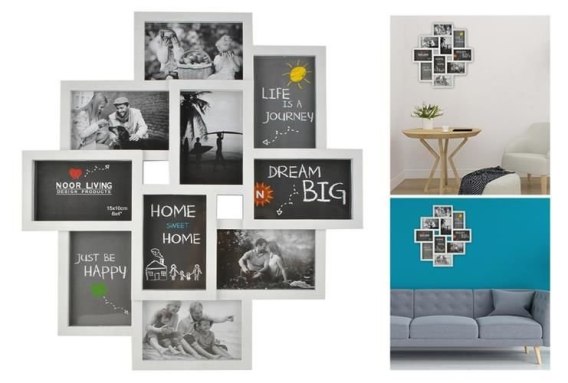 ATRAKCYJNY EFEKT DEKORACYJNY-ramka ma oryginalny kształt;>rozmieszczenie zdjęć daje interesujący efekt kolażu; sprawdzi się jako miły akcent wystroju wnętrz i nada im charakteru.