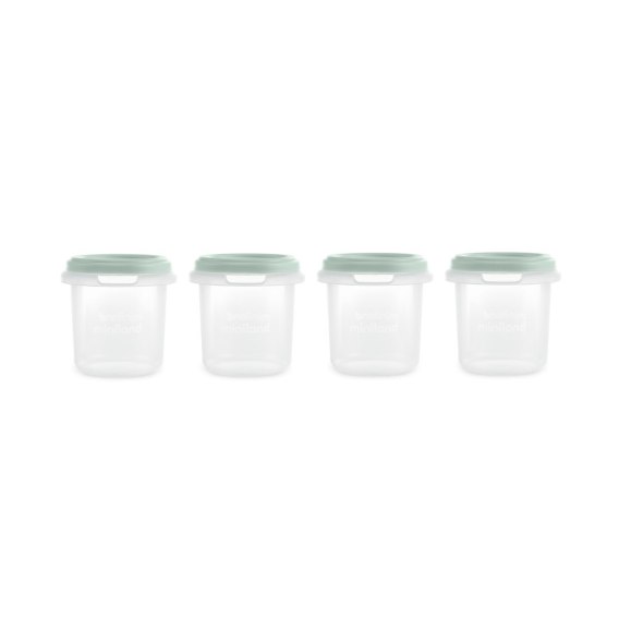 Kompletny zestaw 4 hermetycznych pojemników z podziałką o pojemności 200 ml każdy, z pokrywkami w kolorze miętowym. Szczególnie polecany do przechowywania, podgrzewania, zamrażania lub transportu mleka matki, pierwszej kaszki dziecka, a także wszelkiego rodzaju pokarmów stałych i płynnych.