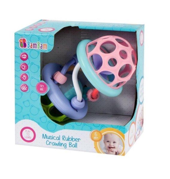 GUMOWA MUZYCZNA KULA BAM BAM to zabawka edukacyjna, która zapewniając dziecku doskonałą zabawę, jednocześnie dostarcza pełną gamę bodźców umożliwiających jego harmonijny rozwój. Dzięki dwóm, miękkim na końcach zabawki kulom o zróżnicowanej fakturze oraz z dużymi otworami chwytanie, trzymanie, jak i potrząsanie zabawką jest niezwykle łatwe i poręczne. Wewnątrz kul zamieszczony po jednej stronie kołowrotek, a po drugiej kolorowa kula migocząca w rytm 14 popularnych melodii zapewniają wrażenia wizualne oraz dźwiękowe stymulując rozwój wzroku i słuchu. Na wiralnie skręconych obręczach łączących gumowe kule, ulokowane barwne koraliki dodatkowo urozmaicają zabawę o możliwość wydawania dźwięków oraz ich przesuwania, co doskonale wzmacnia zdolności manualne dziecka. Zabawka dla dzieci od 6 m-ca.