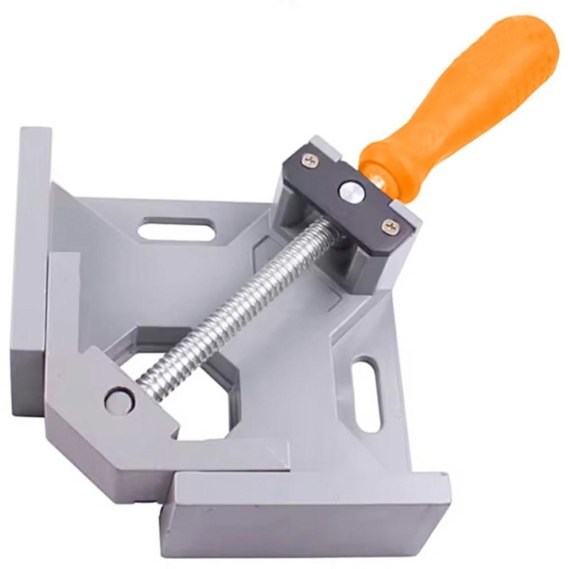 Stolarski ścisk kątowy - narożny zacisk montażowy. Niezbędny podczas pracy i majsterkowania przy drewnie. Zdecydowanie ułatwia montaż elementów drewnianych i połączeń kołkowych. Wykonany z solidnego stopu metalu, ze szczęką umieszczoną pod kątem prostym (90 stopni). Wyposażony w mocną śrubę dociskową oraz gumowane uchwyty zacisku, które zabezpieczają ustawioną pozycję.