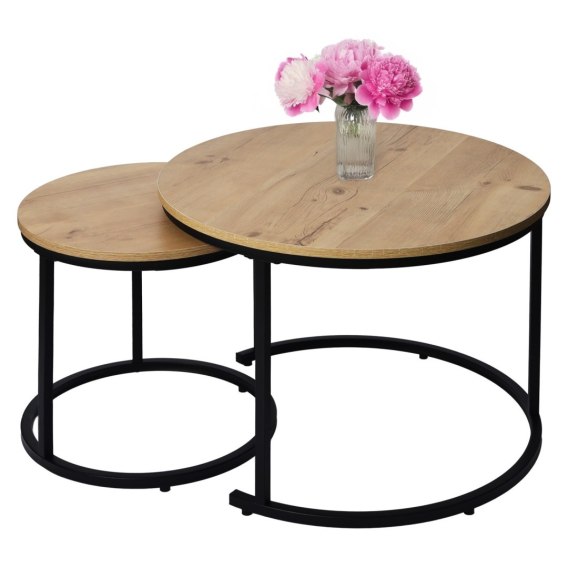 Nowoczesne stoliki kawowe okrągłe zestaw 2w1 loft industrial ława stół stolik dąb antyczny jasny