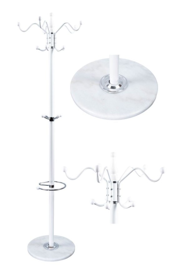 Nowoczesny i praktyczny wieszak ubraniowy o wyjątkowym designie. Wykonany został z najwyższej jakości materiałów z dbałością o każdy szczegół. Wieszak składa się z trzonu ze stali malowanej proszkowo, chromowanych elementów i solidnej marmurowej podstawy. Posiada aż 16 ergonomicznych ramion, dzięki którym można powiesić na nim dużą ilość odzieży. System obrotowy ułatwia szybki dostęp do odzieży. Model posiada także wbudowany stojak na parasole. Zastosowanie grubych stalowych rurek i masywnej, solidnej marmurowej podstawy gwarantuje stabilność i bezpieczeństwo wieszaka. Estetyczny biały kolor sprawia, że model pasuje do każdego wnętrza. Idealnie dopasuje się w nowoczesne wnętrza. Wieszak idealnie sprawdzi się w Twoim domu, biurze czy firmie.