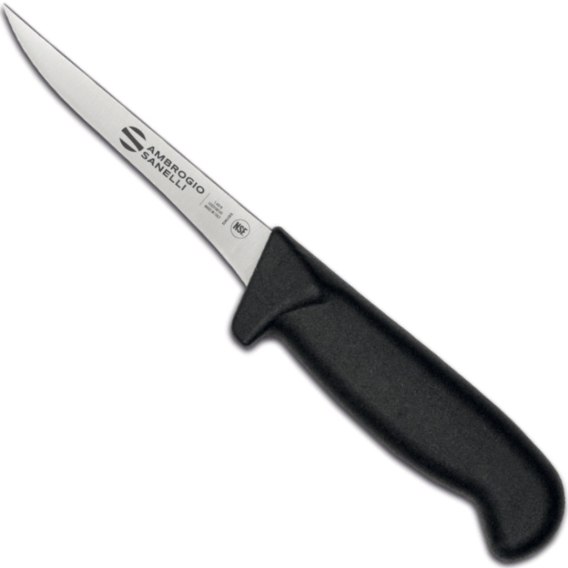 Nóż marki Ambrogio Sanelli z linii SUPRA to profesjonalne narzędzie przeznaczone dla szefów kuchni. Sprawdzi się szczególnie do oddzielania mięsa od kości. Posiada ostrze wykonane z wysokiej jakości stali nierdzewnej NITRO-B, w której dodatek cząsteczek azotu znacznie polepsza właściwości antykorozyjne oraz końcową twardość po ulepszaniu cieplnym. Ergonomiczny uchwyt wykonany został z trwałego tworzywa SEBS, które jest elastyczne i odporne na działanie czynników atmosferycznych, ozonu i UV. Nóż nadaje siędo sterylizacji, jest wysoce odporny na uderzenia i korozję. Nie nadaje się do mycia w zmywarce.