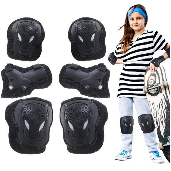 W zestawie znajdują się ochraniacze na nadgarstki, łokcie i kolana