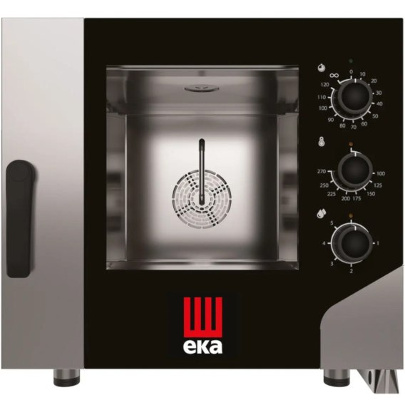 Piec konwekcyjno-parowy Millennial Smart Gastro marki Tecnoeka to nowoczesne urządzenie kuchenne z mniejszą komorą pieczenia, szczególnie polecane dla profesjonalnej gastronomii. Piec umożliwia przygotowanie posiłków w suchym, gorącym powietrzu lub z wykorzystaniem funkcji zaparowania. Piec posiada prowadnice na 5 pojemników GN 1/1 (brak w zestawie). Obudowę wykonano w całości ze stali nierdzewnej. Funkcja zaparowania posiada 5 stopniowa regulację. Urządzenie wyposażono w skuteczną izolację, co pozwala na oszczędność energii elektrycznej. Czas regulowany jest w zakresie 10-120 min lub praca non stop. Zewnętrzna szyba pieca jest chłodzona grawitacyjnie. Piec sterowany jest elektromechanicznie za pomocą 3 pokręteł. Temperatura regulowana jest w zakresie 100-270°C. Piec posiada funkcję bezpieczne drzwi - blokada otwarcia przy 60°, 90°, 120° i 180° zapobiegająca oparzeniom spowodowanym przez ruch drzwi. Podwójnie przeszklone drzwi do komory oraz oświetlenie LED ułatwiają kontrole procesów w piecu. Drzwi posiadają zawias po prawej stronie. Wygodne otwieranie wewnętrznej szyby drzwi ułatwia jej czyszczenie. Uszczelka drzwi została wykonana z grubego i odpornego silikonu, jest łatwa do samodzielnej wymiany. Rynienka pod drzwiami zapobiega kapaniu skondensowanej pary. Tłoczona komora pieca ma zaokrąglone narożniki, które ułatwiają czyszczenie. Współczynnik szczelności wynosi IPX4. Regulowane nóżki umożliwiają idealne wypoziomowanie. Wymagane jest podłączenie do prądu, wody uzdatnionej, kanalizacji.