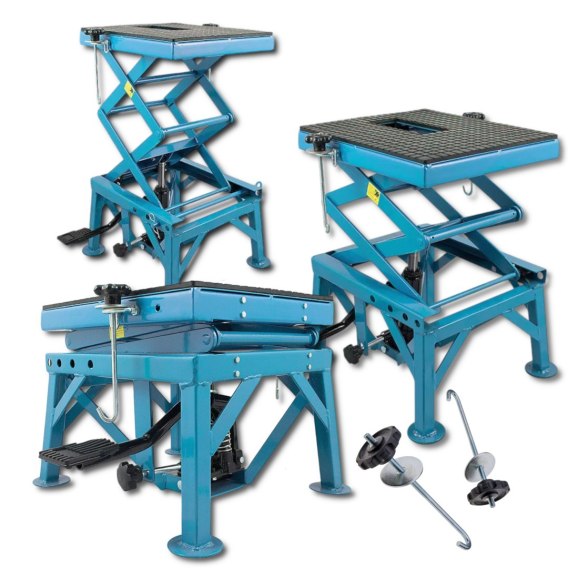 Hydrauliczny podnośnik nożycowy o udźwigu 135 kg z 3-stopniową regulacją wysokości (60 cm, 75 cm, 87 cm). Gumowa platforma, stabilna konstrukcja i kompaktowy rozmiar czynią go idealnym do prac serwisowych i napraw motocykli.