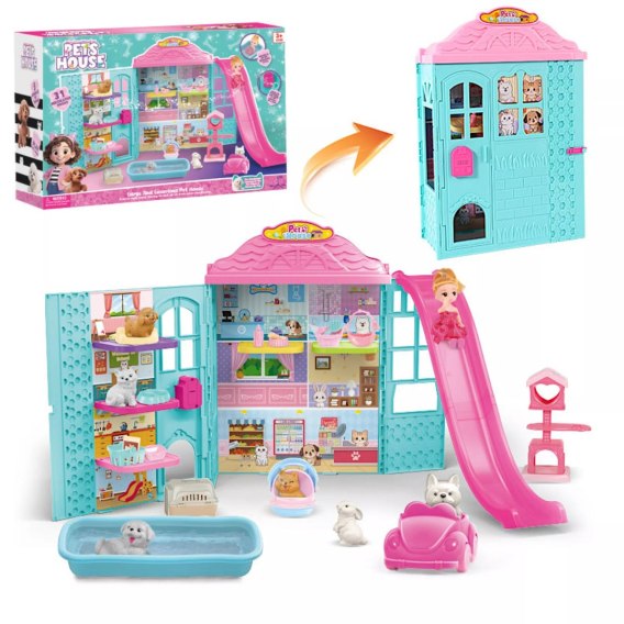 Zaskocz swoje dziecko składanym domkiem dla lalek ze zwierzątkami i zjeżdżalnią!