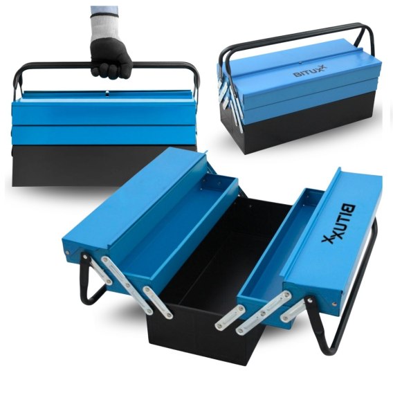 Przenośna składana skrzynka narzędziowa Bituxx to solidne rozwiązanie do przechowywania i transportu narzędzi. Służy do organizacji elektronarzędzi, ręcznych narzędzi i akcesoriów; kluczowy parametr to uchylna konstrukcja umożliwiająca pełny dostęp do wnętrza.